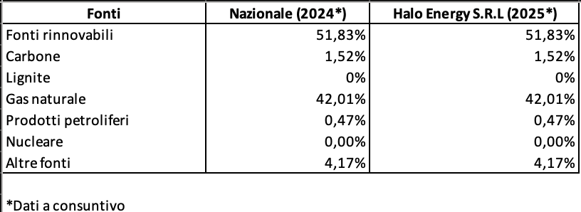 Il Mix di approvvigionamento di Halo Energy S.R.L.: indica le fonti utilizzate per produrre l’energia elettrica che Halo fornisce ai propri clienti nello stesso anno.